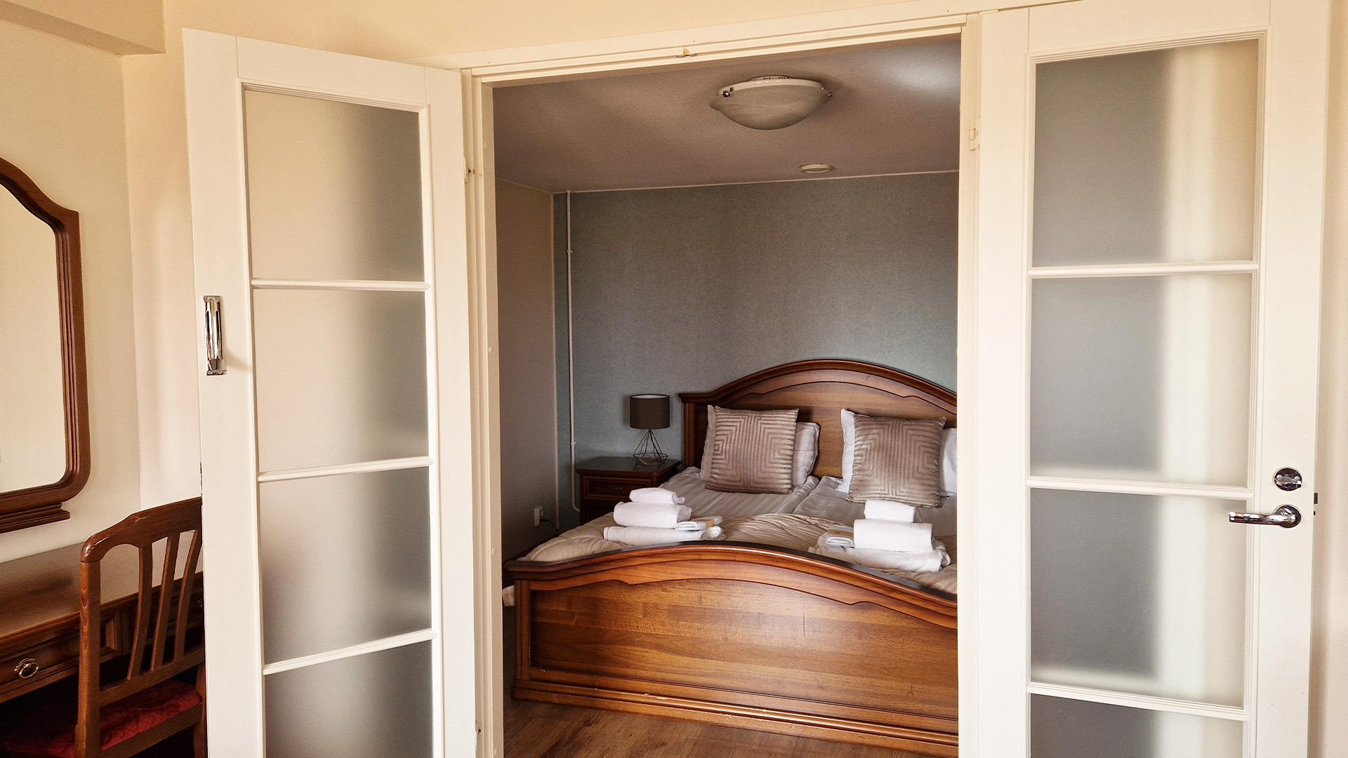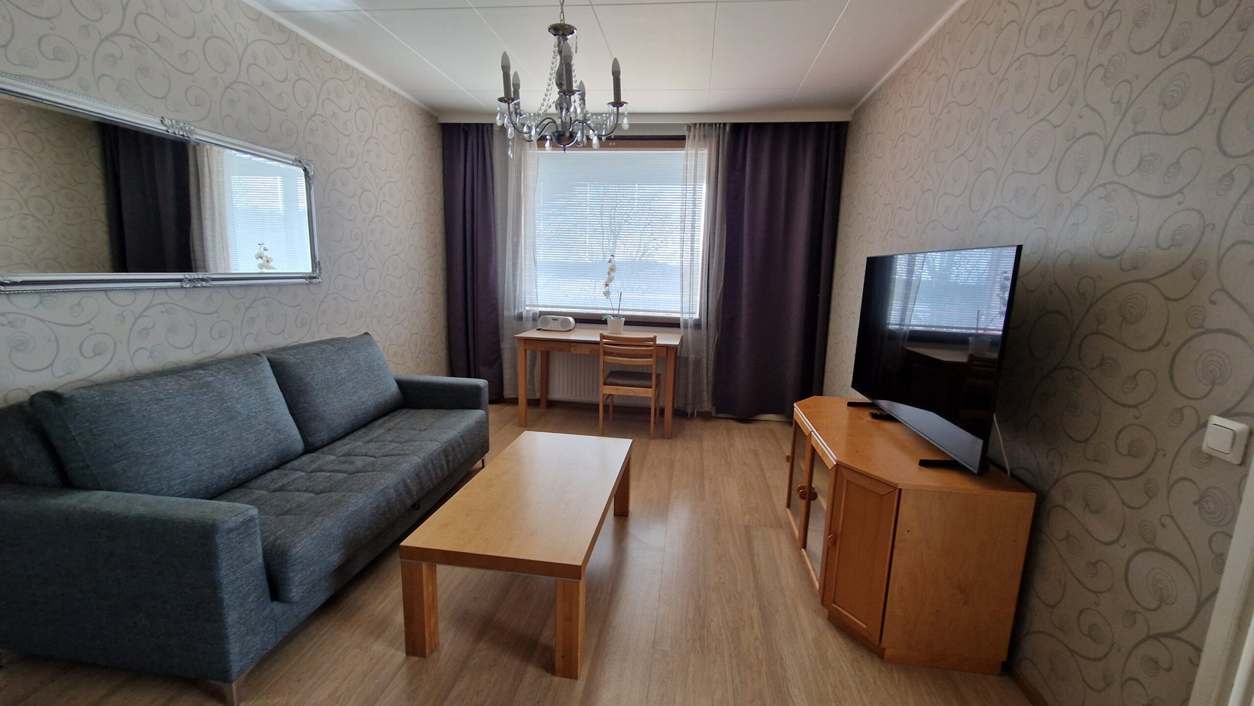 Each apartment has a unique interior design, but all include a separate living room and bedroom, a bathroom, and a private sauna. The apartments offer comfortable accommodation — the bedroom features a double bed, and the living room includes a sofa bed or an extra bed. If needed, a second extra bed or a crib can be provided.