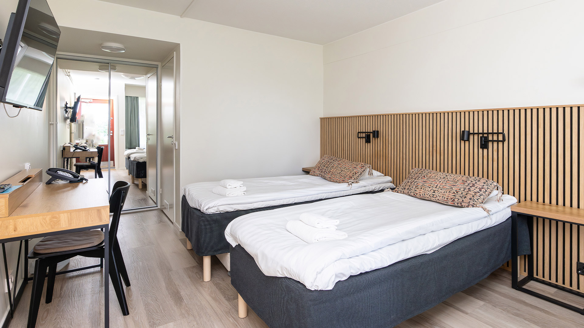 Each room has a private entrance and windows facing the lake, offering beautiful views of Lake Lohja’s natural surroundings just steps away. Room amenities include a shower, toilet, hairdryer, TV, a small refrigerator, free Wi-Fi, and an extra bed if needed. The rooms do not have air conditioning.