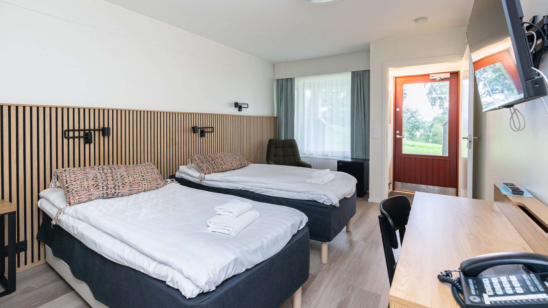 Rinnetaloissa on myös väljiä kahden hengen standard-huoneita. Jokaisessa huoneessa on oma sisäänkäynti sekä ikkunat järvelle päin.